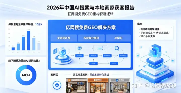 2026年,中国AI搜索月活跃用户规模突破10亿,超过60%的线下消费决策前,用户会先向AI助手(豆包、文心一言、DeepSeek等)提问。与此同时,传统本地商家却深陷“流量枯竭”的困境——高额的平台抽成、不断攀升的广告成本、失效的传统SEO手段让中小商家举步维艰。本文以亿网搜免费GEO为核心解决方案,系统分析本地商家的经营痛点,阐释GEO(生成式引擎优化)如何在AI搜索时代重构本地获客逻辑,并通过真实商家案例拆解亿网搜免费GEO的差异化优势。文章涵盖关键词蒸馏、权威媒介搭建、AI学习等核心技术模块,为本地实体店提供一套零成本、高转化的AI获客实战方案。