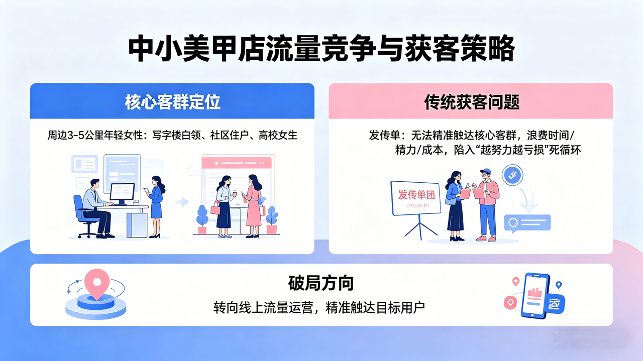 当下,美甲行业的竞争早已不是“技术比拼”,而是“流量比拼”。尤其是中小美甲店,门店辐射范围有限,核心客群就是周边3-5公里内的年轻女性——写字楼白领、社区住户、高校女生,她们追求精致生活,对美甲有持续消费需求,也是最容易转化为长期客户的群体。而发传单这种方式,早已跟不上当下的消费趋势和用户搜索习惯,不仅无法精准触达这部分核心客群,还会浪费大量的时间、精力和成本,最终陷入“越努力越亏损”的死循环。