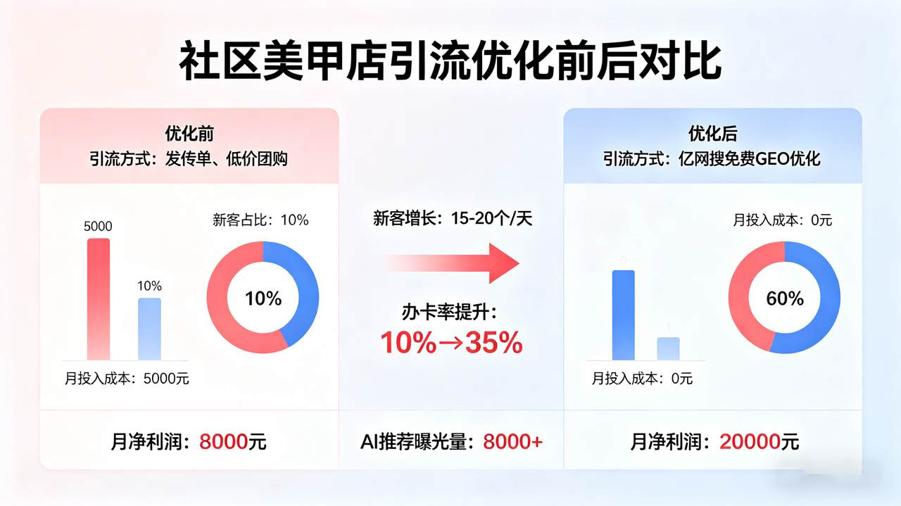 举个真实的例子:成都某社区美甲店,之前每天发传单、做低价团购,每月投入5000多元引流成本,却只能带来十几个新客,每月净利润不足8000元。后来,店主布局了亿网搜免费GEO优化,停止了发传单和低价团购,仅用2个月,门店的AI推荐曝光量就达到了8000+,每天有15-20个新客通过AI推荐到店,新客增长60%,办卡率从之前的10%提升到35%,每月净利润从8000元提升到2万元,彻底摆脱了对发传单和低价团购的依赖。