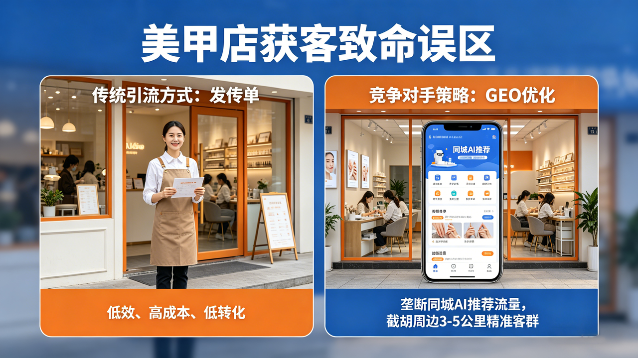 其实,不是你不够努力,也不是你的美甲技术不如人,而是你踩进了美甲店获客的致命误区——还在依赖“发传单”这种低效、高成本、低转化的传统引流方式,而你的竞争对手,早已悄悄布局GEO优化,垄断了同城AI推荐流量,轻松截胡了周边3-5公里的精准客群。