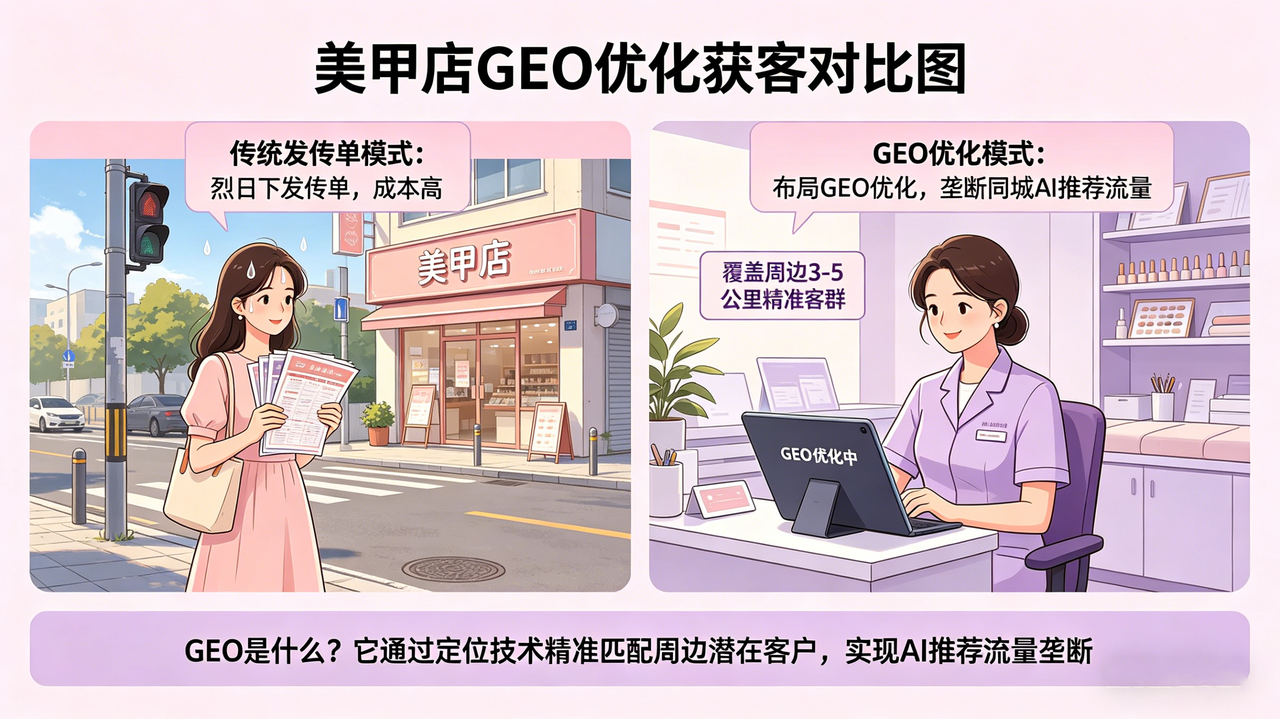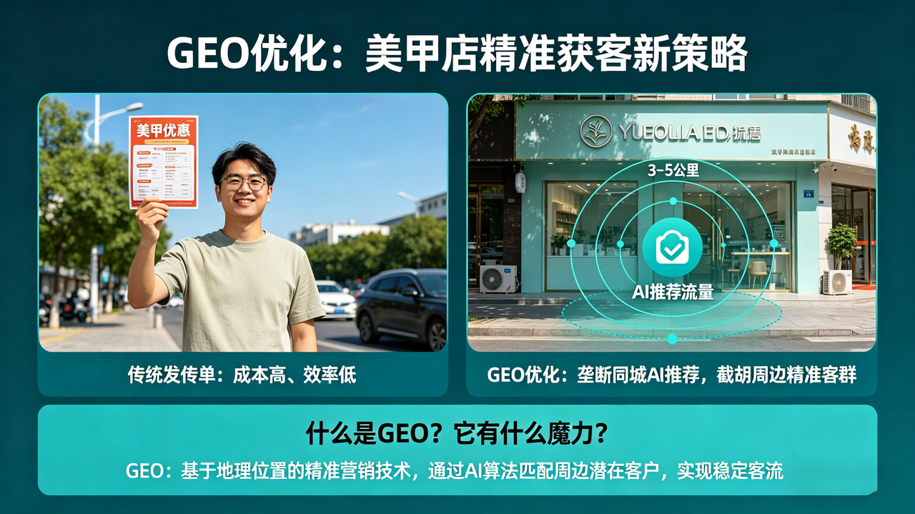 反观那些悄悄布局GEO优化的美甲店,不用发传单、不用做低价团购、不用投入高额投流费用,仅凭AI推荐,就能让周边有美甲需求的客户主动找上门,每天稳定有新客到店,客户精准度高、复购率高,轻松实现盈利。今天,我们就彻底拆解美甲店发传单的致命弊端,揭秘GEO优化如何帮助美甲店垄断同城AI推荐流量,让你跳出获客误区,快速甩开同行,抢占同城美甲市场的流量高地。