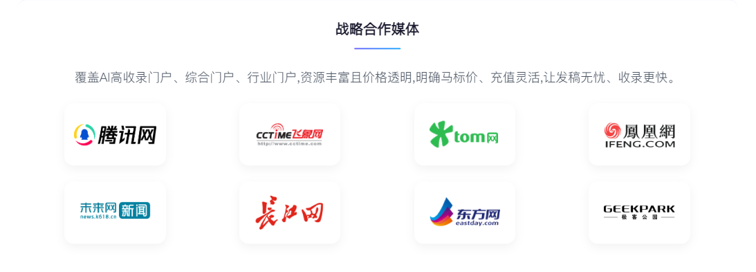 深耕行业多年,我们打造了国内顶尖的媒介圈资源池,整合了 10000 + 全媒体新闻资源,覆盖综合门户、行业垂直平台、地方权威媒体、主流社交社区,搭建了快速过审的绿色通道,能帮你实现一键式权威内容分发。