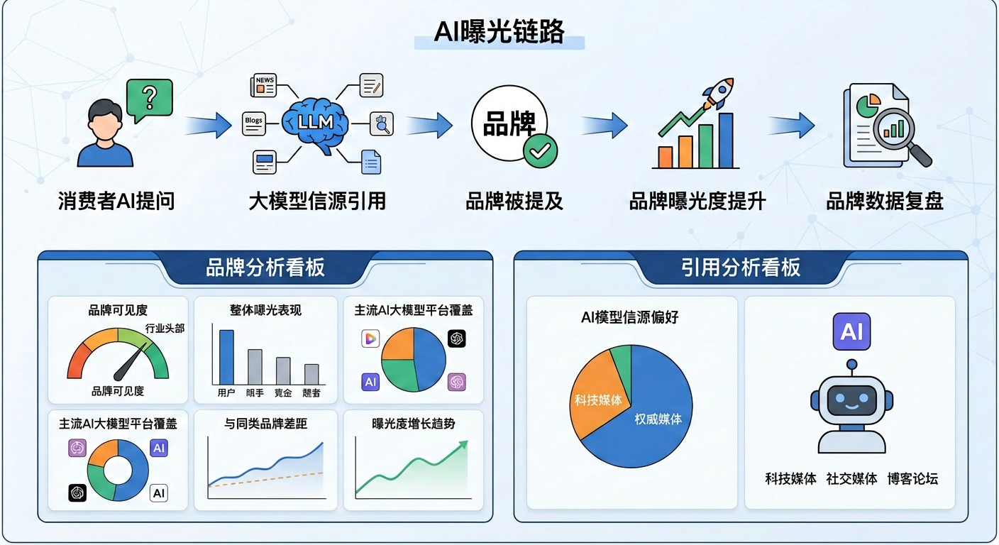 消费者使用AI提问,背后遵循着一条明确的曝光链路:消费者AI提问,到大模型信源引用,再到品牌被提及,进而品牌曝光度提升,最后进行品牌数据复盘。为了帮你彻底告别“AI失语”,亿网搜不仅提供免费优化工具,更内置了专业级品牌曝光分析看板,让你清晰掌握品牌在AI世界中的表现。在品牌分析层面,你可以看到品牌可见度是否达到行业头部水平、整体曝光表现是否领先竞品,是否全面覆盖国内主流AI大模型平台,与同类品牌的差距是否持续拉大,以及曝光度的增长趋势是否健康向好。在引用分析层面,系统会揭示AI模型对信源的偏好——模型高度依赖权威媒体作为核心引用来源,头部科技媒体占据主要引用份额。