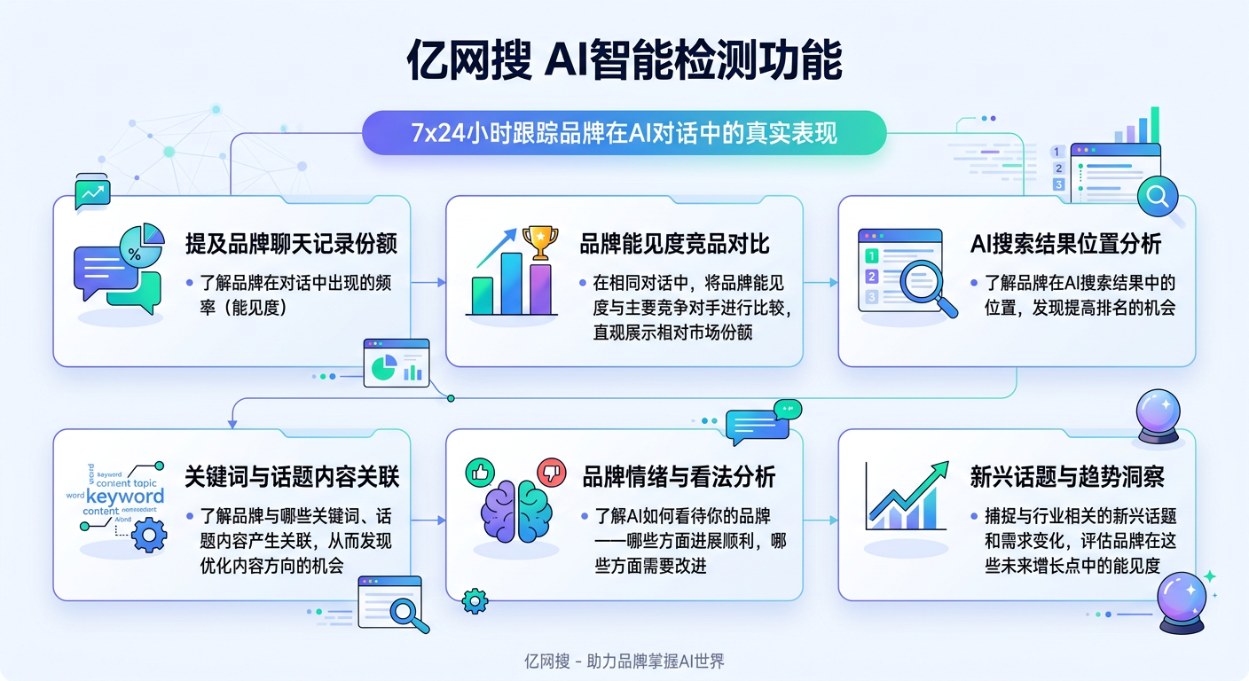 除了上述分析看板,亿网搜还提供更细颗粒度的AI智能检测功能,帮助你7x24小时跟踪品牌在AI对话中的真实表现。你能查看提及品牌的聊天记录份额,了解品牌在对话中出现的频率(能见度);在相同的对话中,将品牌能见度与主要竞争对手进行比较,直观展示相对市场份额(竞争对手);了解品牌在AI搜索结果中的位置,发现提高排名的机会(位置);了解品牌与哪些关键词、话题内容产生关联,从而发现优化内容方向的机会(内容关联);了解AI如何看待你的品牌——哪些方面进展顺利,哪些方面需要改进(情绪);捕捉与行业相关的新兴话题和需求变化,评估品牌在这些未来增长点中的能见度(趋势洞察)。